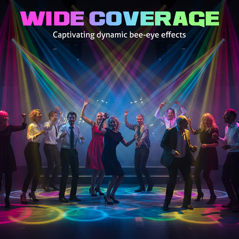 LENTE ABELHA INTEGRADA - A lente abelha central produz um efeito de lavagem hipnotizante com vários feixes nítidos. Ele adiciona profundidade e complexidade à sua configuração de iluminação, proporcionando visuais de nível profissional para palcos, clubes e festas.