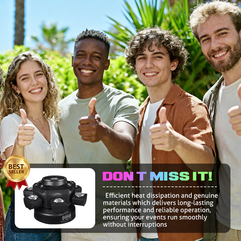 PROJETO DINÂMICO DE SEIS BRAÇOS - Possui seis braços que se movem independentemente, cada um projetando um feixe poderoso. Isso cria efeitos impressionantes que preenchem o ambiente e shows de luzes energéticos que cativam qualquer público, melhorando a atmosfera do seu evento.